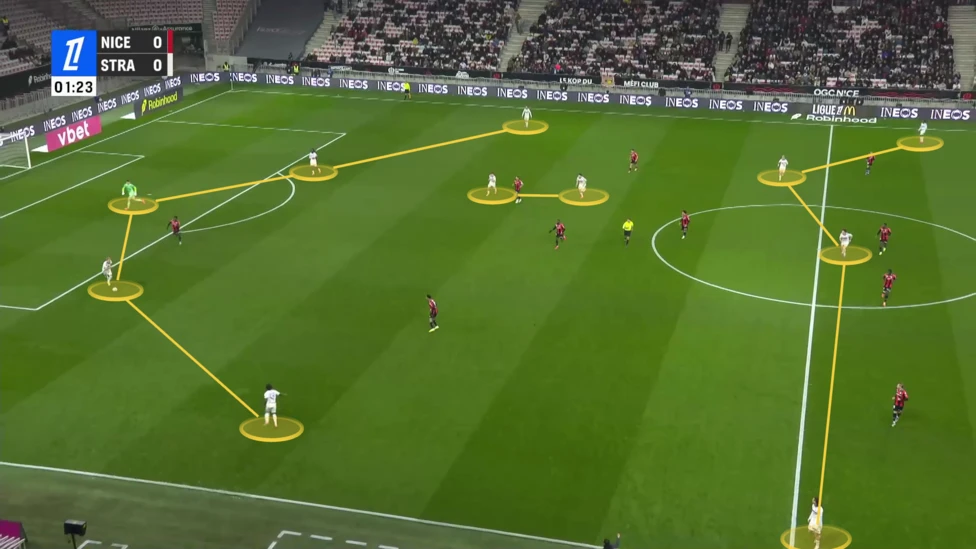 2. เกมรุก: ระบบ “Box Midfield” ที่แตกต่างจากมาเรสก้า สิ่งที่น่าสนใจที่สุดคือตอนครองบอล โรซีเนียร์จะปรับทีมเป็นระบบ 3-2-2-3 คล้ายกับ เอ็นโซ่ มาเรสก้า กุนซือคนก่อน แต่มีจุดต่างสำคัญคือ: